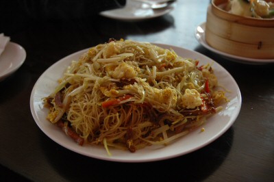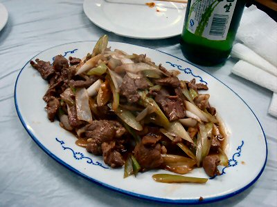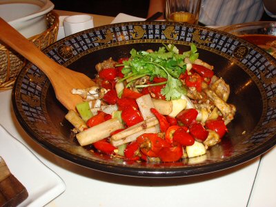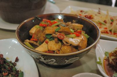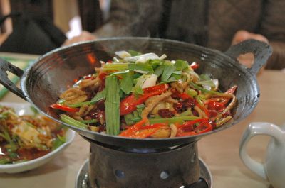 | あまり辛くはないですが、カレー味の焼きビーフン。 | 干鍋は炒め物を鍋に入れて再度煮る調理法。これは牛の胃ですが、豆腐や牛肉等、色々なバージョンがあります。 | |||||||||||||