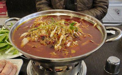 | 蒸した(茹でた)鶏を骨ごとぶつ切りにしてラー油のソースをかけた物。 | 日本で言うセンマイ(牛の胃)の火鍋。沢山のもやしとセンマイが入ってます。 | |||||||||||||