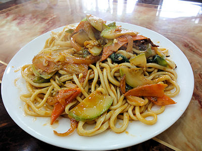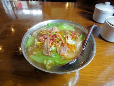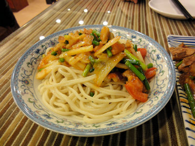 | 手延べの太めの面にトマト、羊肉、タマネギ、ピーマンを炒めたソースがかかっています。トマトソースのパスタに近い。 | どこの料理にも有りますが、湖南料理のは生のトウガラシが入っていて、結構ピリ辛。 | |||||||||||||
