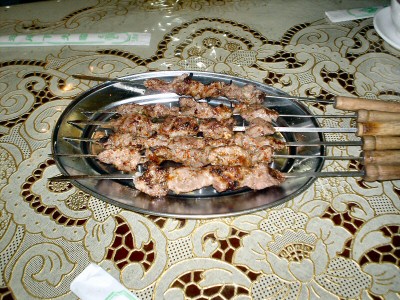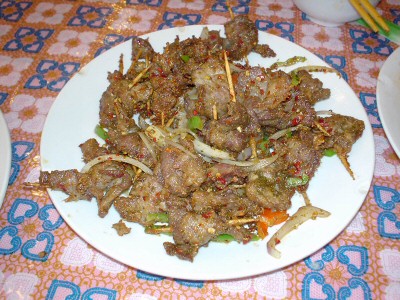 | よく屋台で売ってますが羊肉にイスラムでよく使う香辛料をかけて炭火で焼いた物。独特な味と匂いですが、これでビールを飲むと最高。 | 豚の腸を油で揚げてトウガラシ、ピーマン等と炒めた物。ご飯に合います。 | |||||||||||||