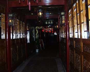 | 門をくぐると、この廊下が続きます。 中庭を取り巻くようにテーブルが並び、 一番奥で琴や胡弓の演奏をしています。 |