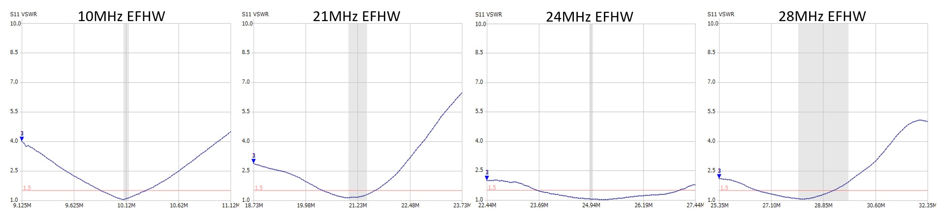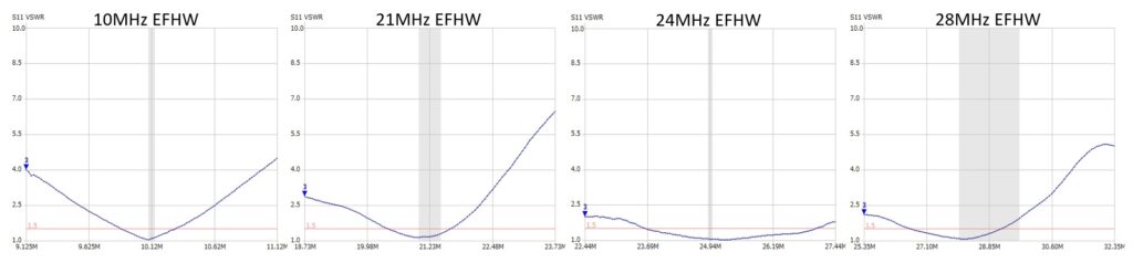 その他のEFHWのSWRはこんな感じ ほぼフルサイズなので雨が降っても特性は変わりません。