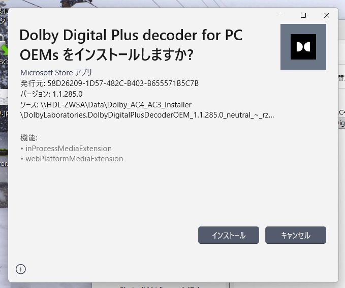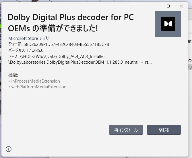 ここからDolby_AC4_AC3_Installer.zipをダウンロード。Zipファイルの中身のDolbyLaboratories.DolbyDigitalPlusDecoderOEM_1.1.285.0_neutral_~_rz1tebttyb220 (1)を実行する。